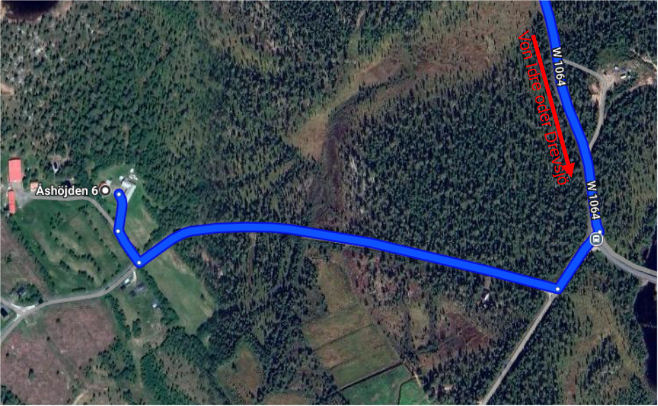 Anfahrt mit dem Fahrzeug von Idre: Auf der 70 Richtung Flötningen / Drevsjö. Nach Drosbacken links Richtung Drevdagen. Kurz vor der Brücke vor Drevdagen rechts abbiegen und dann die erste Strasse rechts.